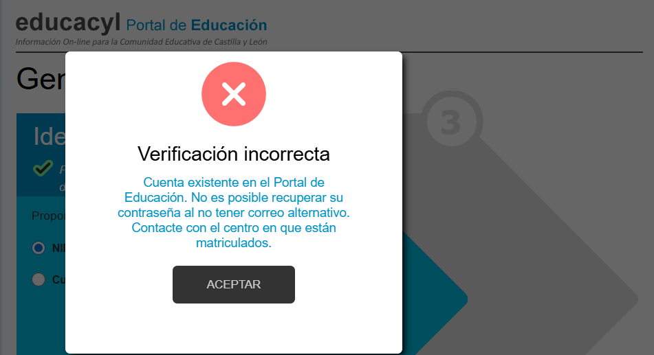 Significa que la Junta no tiene un correo de recuperación alternativo de madre/padre. Deberán acudir a la secretaría del colegio para registrarlo.